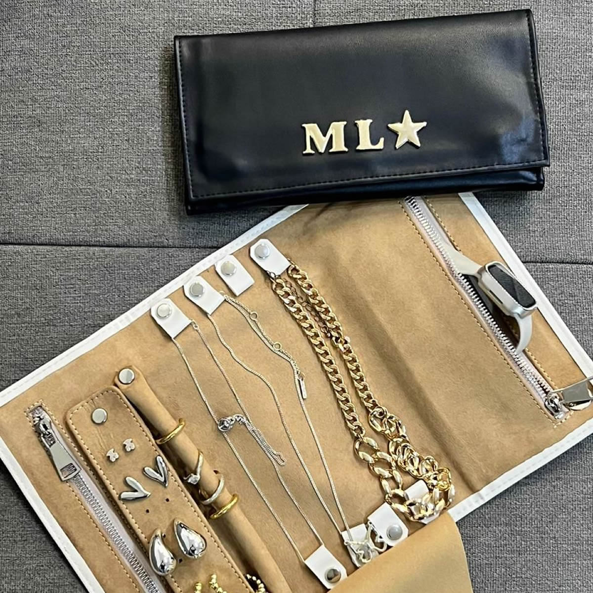 Perfecto para viajar con estilo, guardar aretes, anillos y collares, y mantener todo en su lugar con un toque de sofisticación y practicidad.